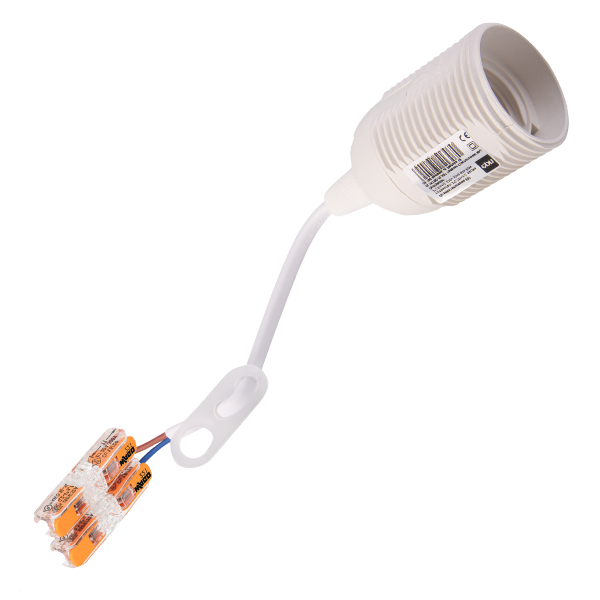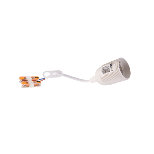 Model wyposażony został w przewód 2x0,75 mm² o długości 10 cm, zakończony nowoczesnymi i praktycznymi złączkami WAGO 221-2411. Umożliwia to szybkie i bezproblemowe podłączenie oprawki do instalacji elektrycznej. Dodatkowo oprawka posiada zawieszkę, która pozwala na łatwe zamocowanie jej pod sufitem.