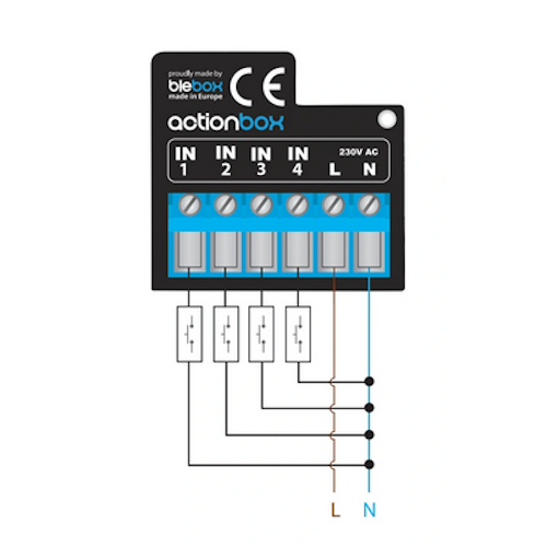 Niewielki moduł zasilany napięciem 230 V, który pozwala na sterowanie innymi sterownikami BleBox za pomocą przycisków fizycznych. Komunikuje się poprzez domową sieć WiFi z pozostałymi sterownikami BleBox.