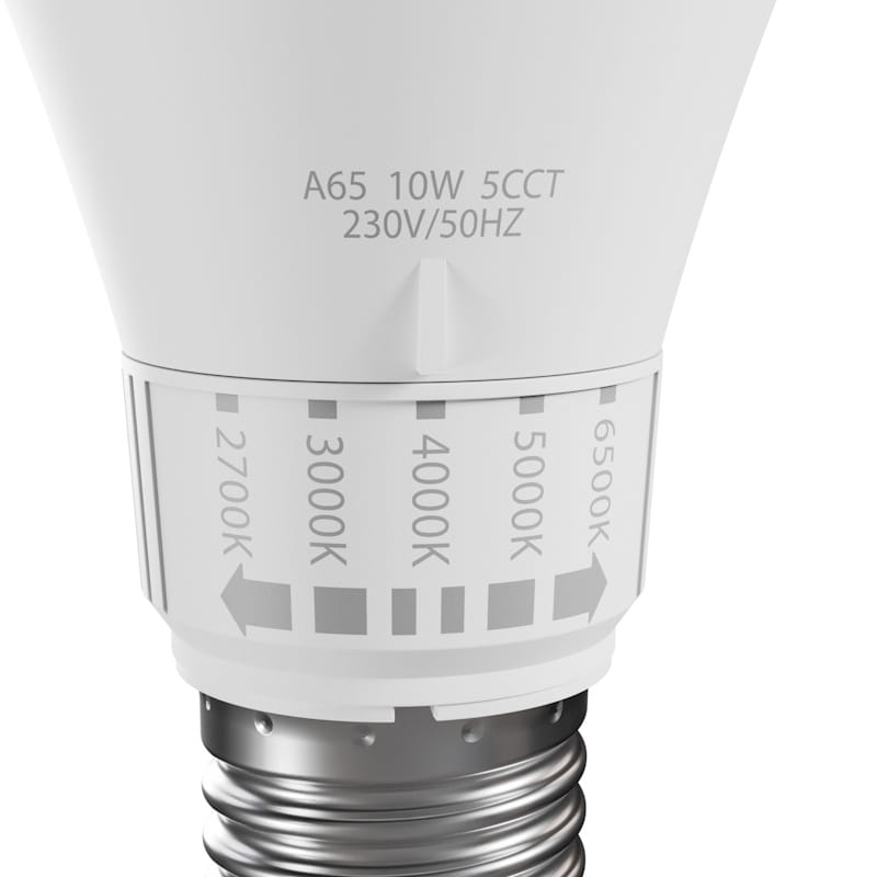 Żarówka LED GLS E-27 10W 5CCT SPECTRUM to energooszczędne źródło światła o klasycznym kształcie tradycyjnej żarówki oraz popularnym trzonku E-27. Model ten umożliwia zmianę barwy światła (CCT) w pięciu zakresach: 2700K / 3000K / 4000K / 5000K / 6500K, dzięki czemu łatwo dostosujesz oświetlenie do aktualnych potrzeb i nastroju.